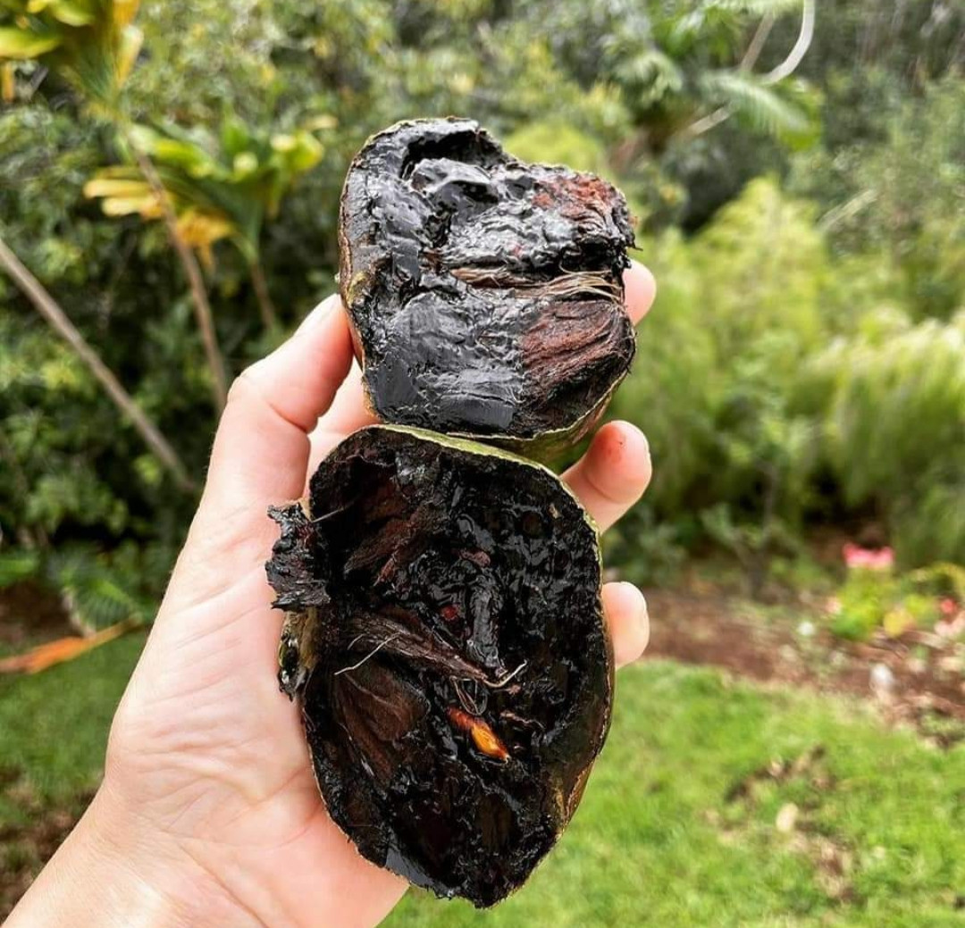 Black Sapotes are round, squat fruits that look similar to a persimmon albeit a green version. The skin of a Black Sapote is initially an olive green and it will darken as it ripens and will develop the occasional black speckles. The pulp is white when unripe and turns dark brown to almost black when ripe. It has a sweet, custardy, chocolate-like flavor, which is how it got its nickname.