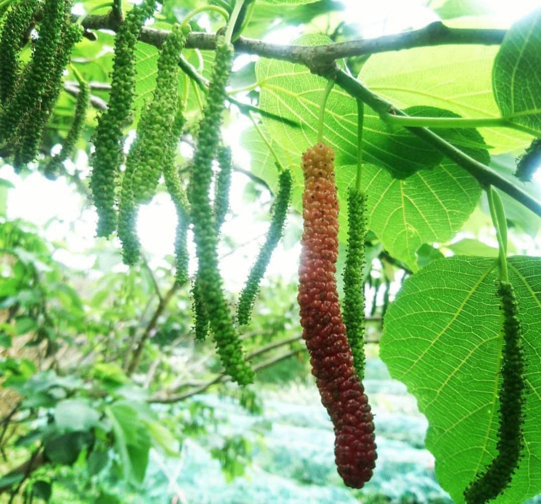 Brazilian Mulberry" is a variety that produces long, very sweet, and tasty fruits. When fully ripe, the fruits turn a dark red color. This type of mulberry is suitable for planting in pots or drums.
