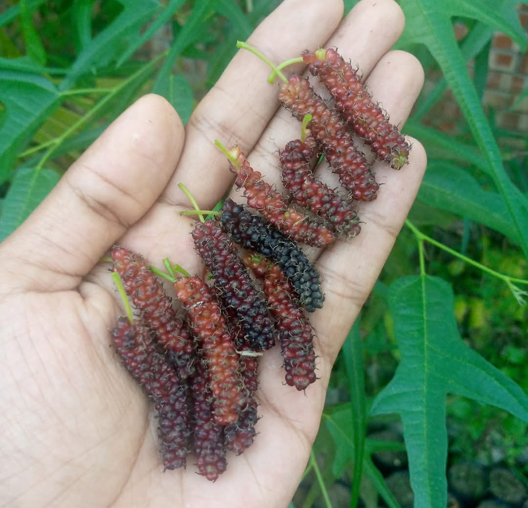 This mulberry leaves looks like chicken's claws and hence the name 'Chicken claw mulberry '.Fruits are long and turn to red colour when fully ripen. Chicken claw mulberry is sweet variety with delicious flavour. Ideal for growing in drum or pots also. Budded plants will start to fruit in just 1 year of planting.