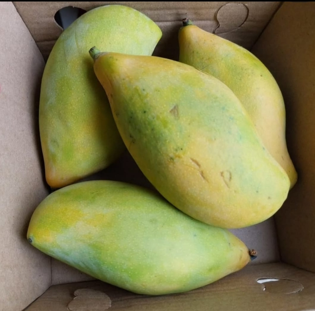 The Totapuri mango, or Ginimoothi, is a cultivar that is widely grown in south India and is partially cultivated in Sri Lanka.It also goes by the names Bangalore, Collector, Kallamai, Kili Mooku, Gilli, Mukku, "Ottu", and Sandersha.In Bengaluru it is referred to as Ginimoothi Maavina Kayi, while most of the rest of India calls it Totapuri or Bangalora. It literally translates to parrot face (gini = parrot, muthi = beak). Totapuri mango skin lacks the usual bitter taste of most mango skins or has a very slight bitterness and is consumed with the flesh traditionally.