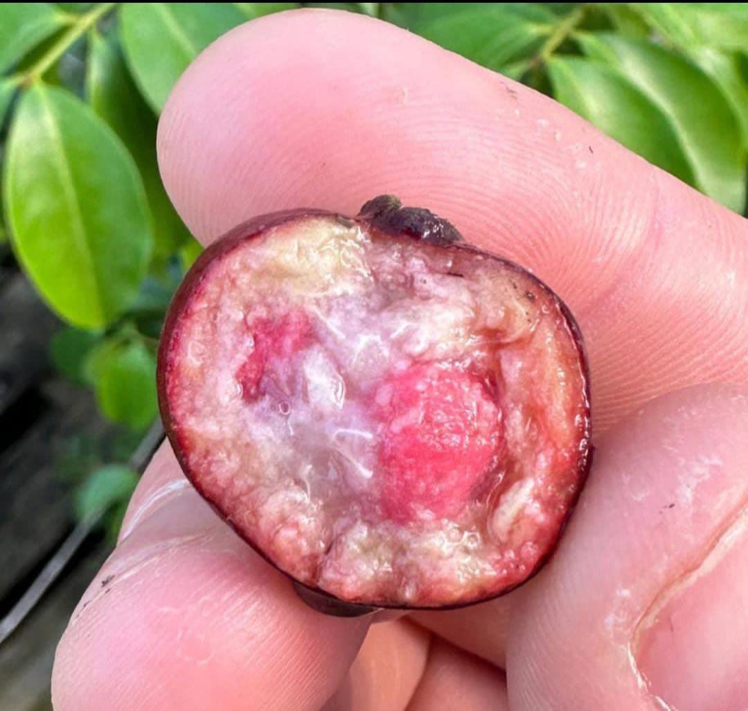 Purple Forest Guava" (also known as Psidium Eugeniaefolia or "Araca-Una") is a bushy shrub tree from the Atlantic rainforest of Brazil, related to the guava family. It has glossy leaves similar to the Strawberry Guava. The fruits are round and have a smooth skin that ripens from a muddy green to a dark purple. The inner flesh is a vibrant, translucent purple with a slightly acidic and sweet flavor. This fleshy pulp surrounds several small, hard seeds, and the fruit is typically eaten fresh.