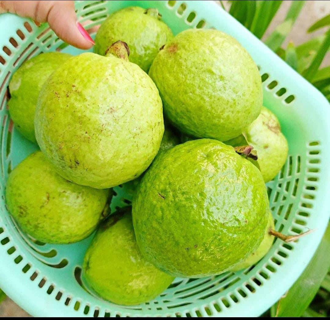 Thai 7 Guava" is a variety with an apple-green skin that can be either bumpy or smooth, and is generally the size of a softball. The interior flesh is white with pale yellow seeds and has a drier texture compared to pink guava varieties. Known for its delicious and nutritious qualities, this guava is sweet and has a unique texture. The plants are highly productive, yielding a large amount of fruit at once, with individual fruits weighing an average of 250 to 750 grams.
