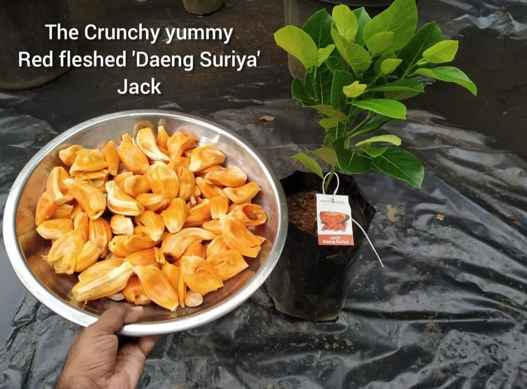 Jack Daeng Suriya marks it's origin from Thailand, cultivated popularly in asian and american regions. The dark red colour jack fruit is sweet and tasty, crispy too. Budded jack daeng suriya plants will bear fruits with in 3 years. Suitable for the climatic conditions of kerala.