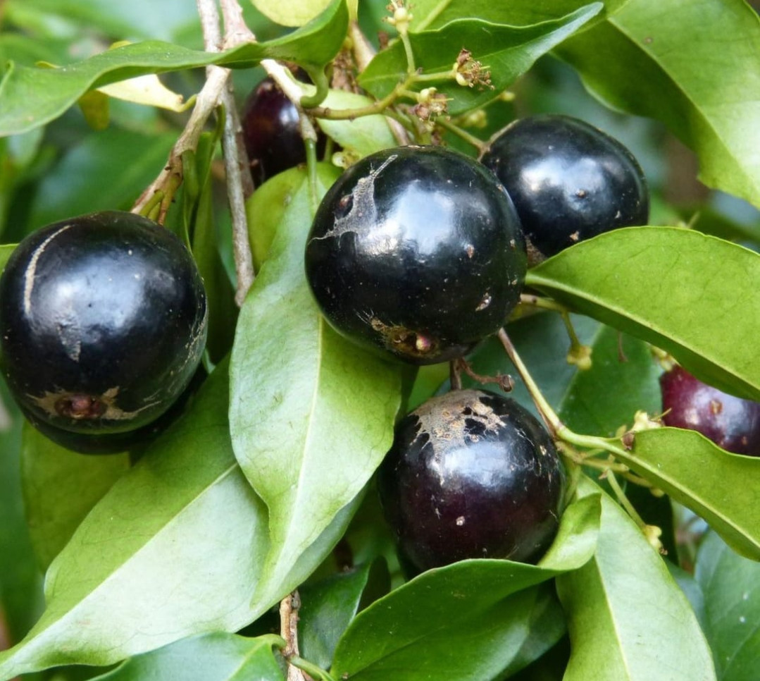 Rain Forest Plum Fruit Plant, Native to Brazil this rare tree have attractive bright green foliage and purple-black fruits. The new growth is rusty-brown, turning yellow and then deep, dark green. The reddish-brown bark peels off naturally showing a smooth reddish trunk.The ripe fruit is a round or slightly elongated berry, It has a thin purple-black skin and a wet, firm, whitish pulp about 3mm thick, surrounding a loose seed. It is edible, moderately sweet, with an aroma similar to the jaboticaba.The fruit are consumed fresh or made into jams.