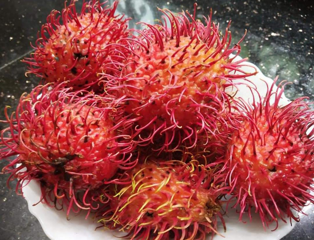 "Caesar Rambutan (Red)" is a new, giant rambutan variety with a globose shape and an average weight of 90 to 120 grams per fruit.This tropical fruit, native to Southeast Asia and part of the lychee family, is sweeter than other rambutan varieties and is primarily consumed fresh.